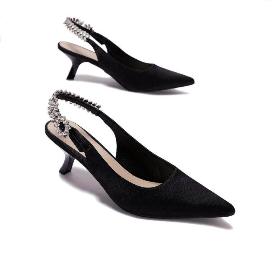 Giày cao gót nữ Melanie Slingback mũi nhọn chất liệu lụa satin màu đen sang trọng gót cao 5cm | ALEX & SARA – AL107